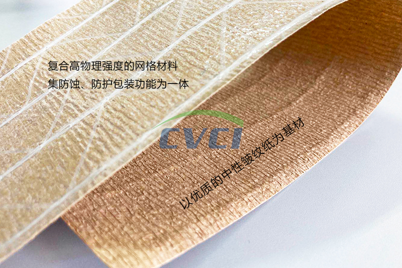 加網(wǎng)復合紙以優(yōu)質的中性皺紋紙為基材,按結構和特性分為皺紋加網(wǎng)復合紙和阻隔型皺紋加網(wǎng)復合紙。產品可添加氣相緩蝕劑,制作成加網(wǎng)型復合氣相防銹紙。